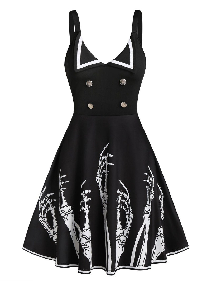 Hand Skeleton Print Mock Button Cami A Line Dress