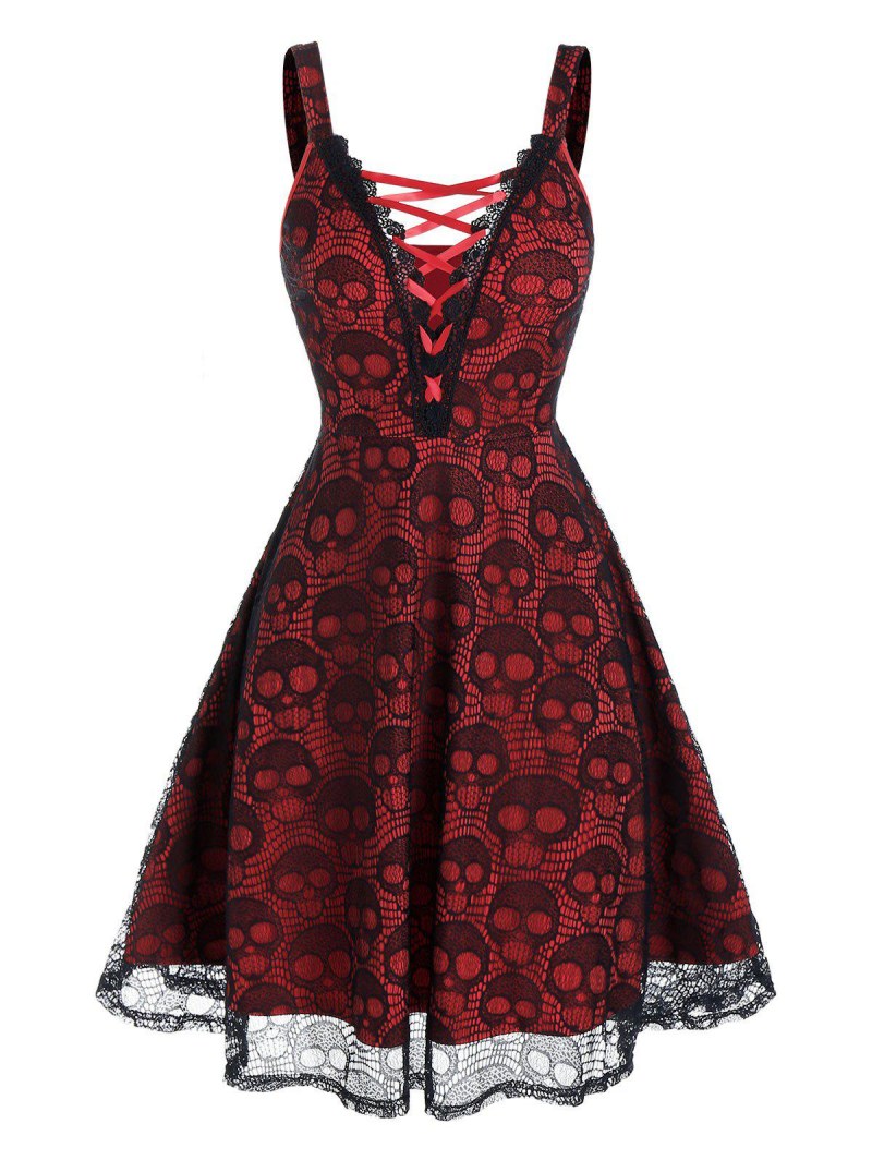 Sleeveless Halloween Criss-cross Skull Lace Dress