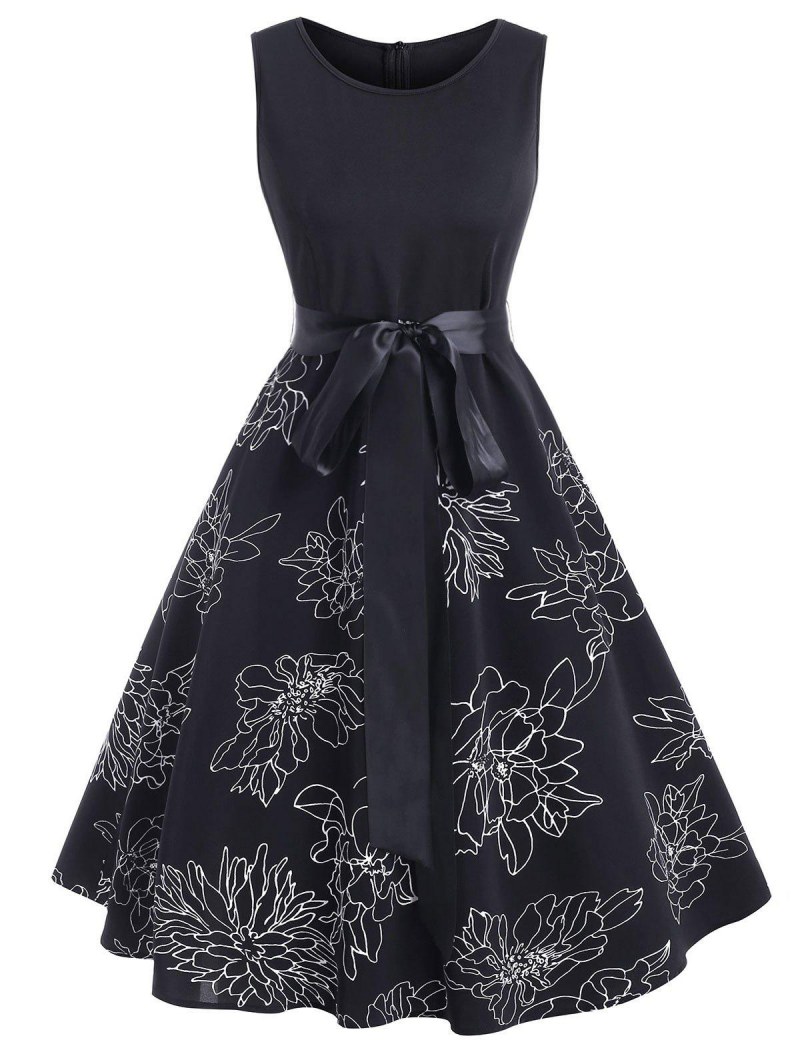 Floral Print Belted A Line Sleeveless Dress