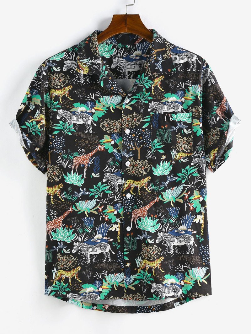 Animals Flowers Print Summer Lapel Pocket Shirt