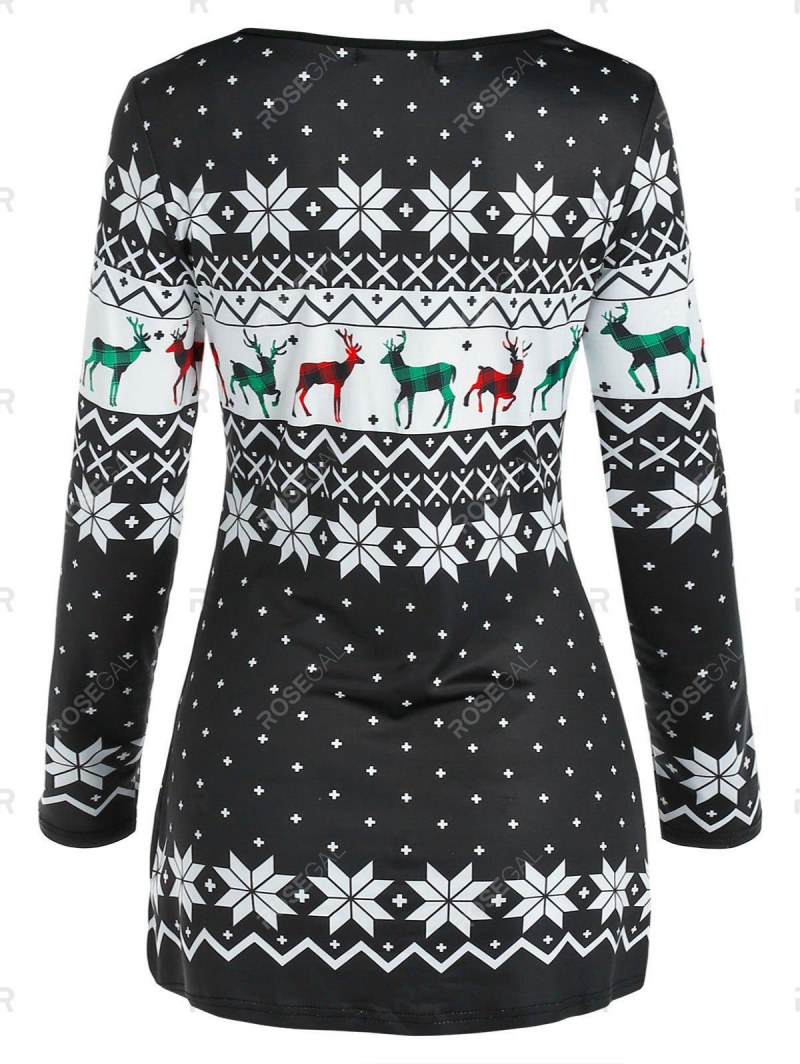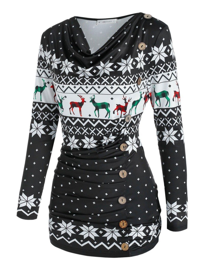 Cowl Neck Christmas Snowflake Elk Print Ruched T Shirt