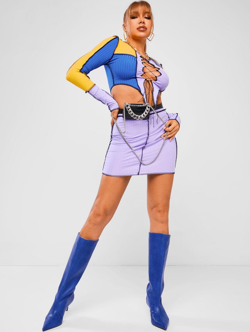 Ribbed Colorblock Topstitching Lace Up Skirt Set