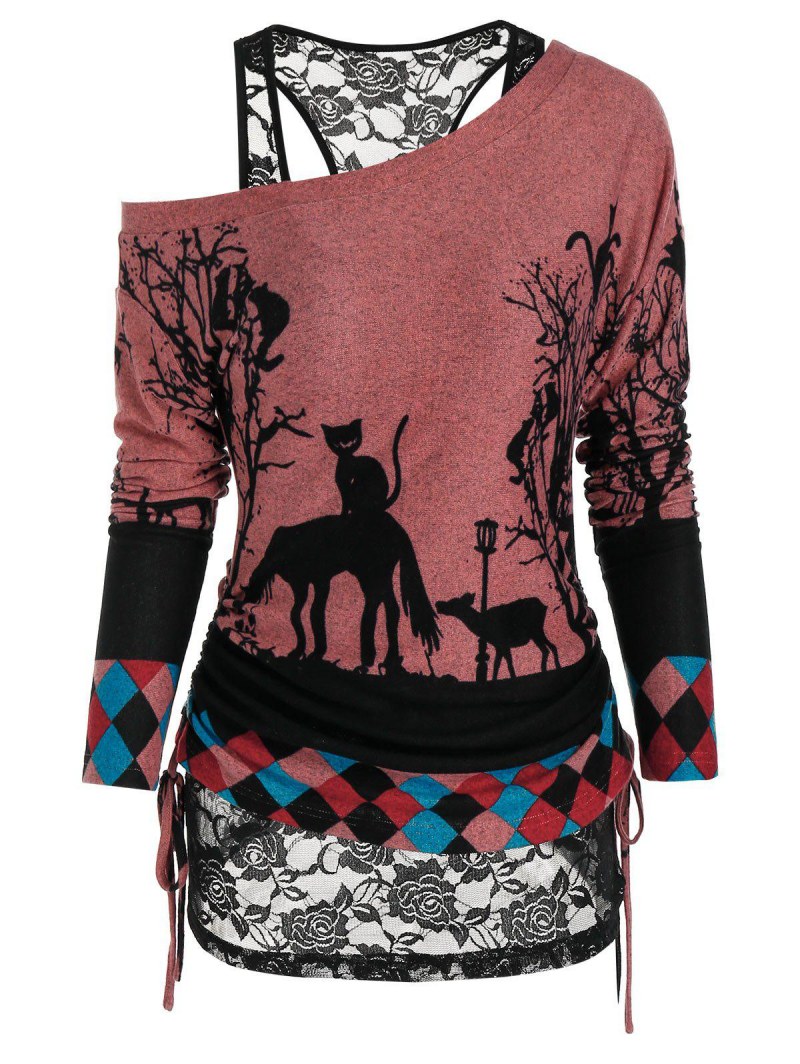 Halloween Cat Print Cinched T-shirt And Flower Lace Tank Top