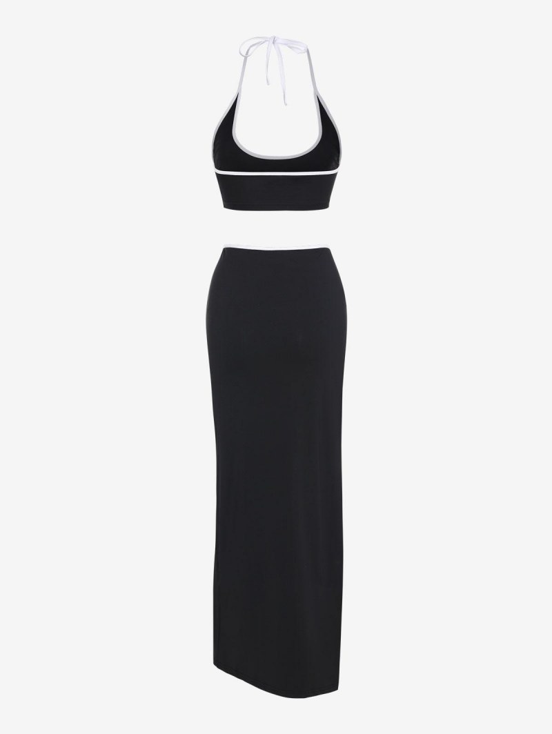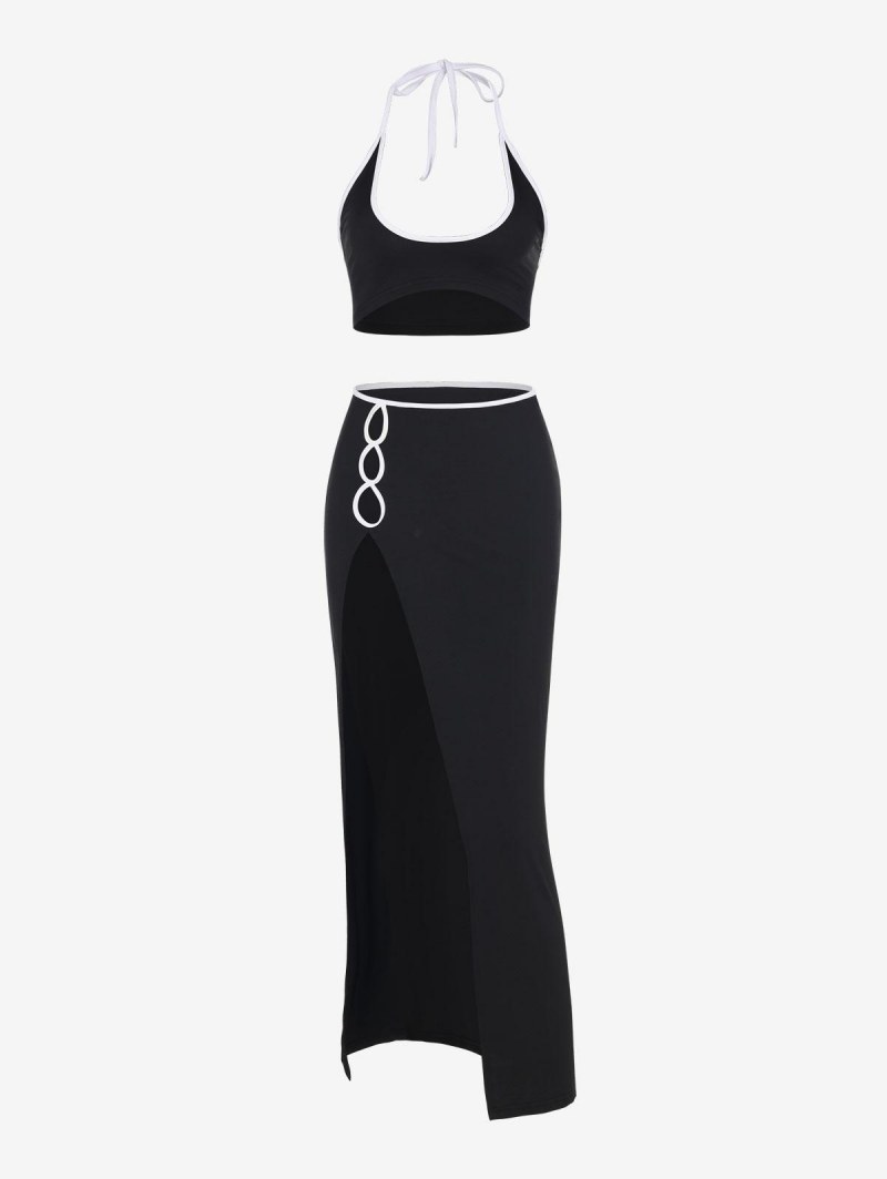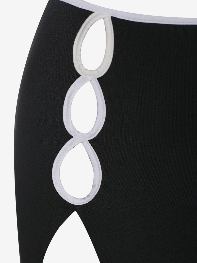 Contrast Piping Oval Cutout Thigh Slit Two Piece Dress